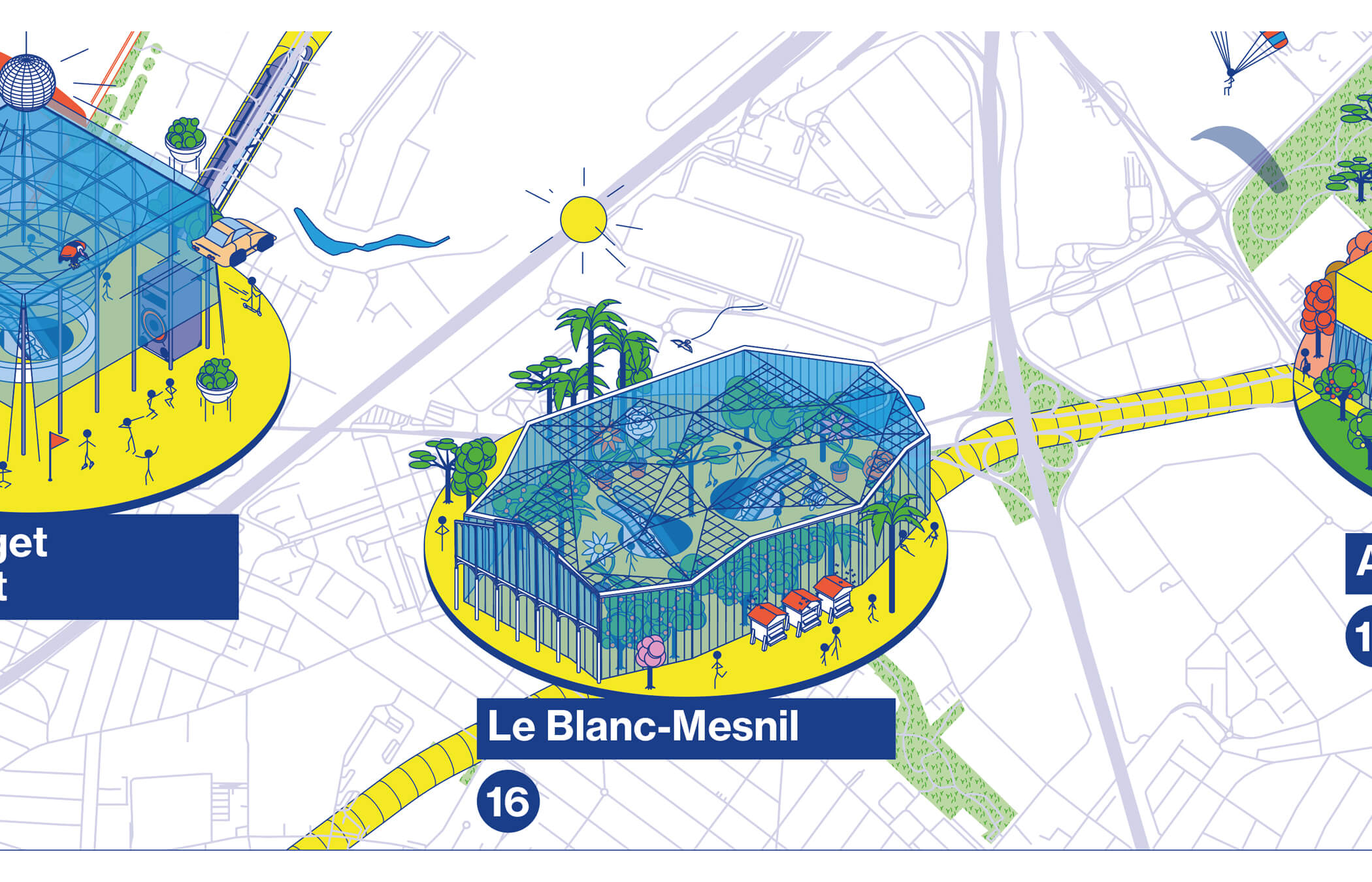 Illustrated map for the subway network Grand Paris Express. Interpretation of 68 architectural projects for train stations. 700 × 1 100 cm. Station architect : Grimshaw Architects